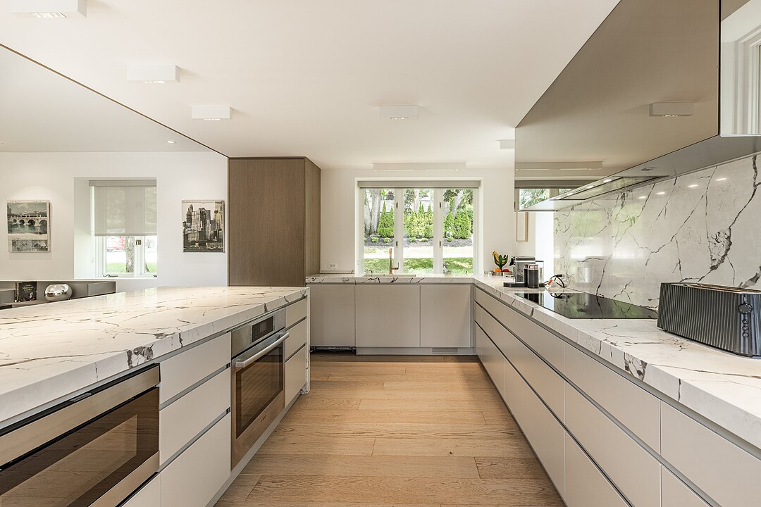 The main floor features a stylish vestibule with built-in storage, a custom architectural staircase, and an open-concept layout perfect for modern living. The chef's kitchen includes state-of-the-art appliances and opens to a spacious dining room--ideal for entertaining. The sunken living room boasts a new gas fireplace and oversized doors that open to a beautifully landscaped garden and terrace. A chic powder room completes the main level.