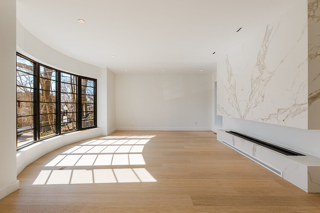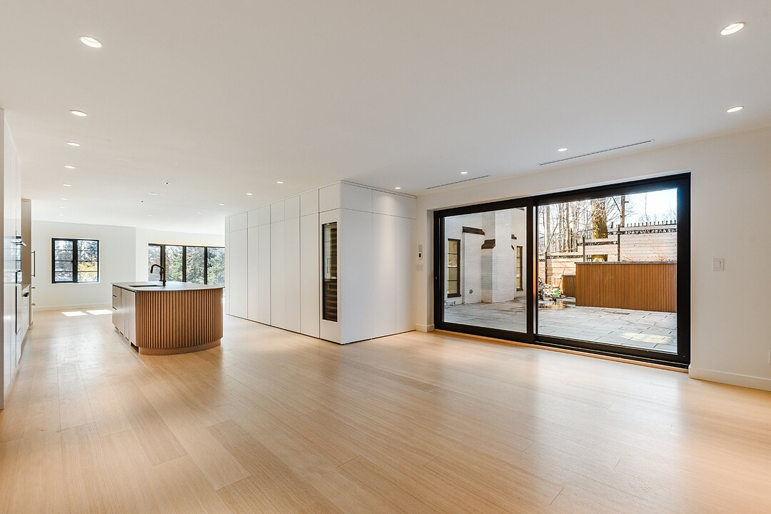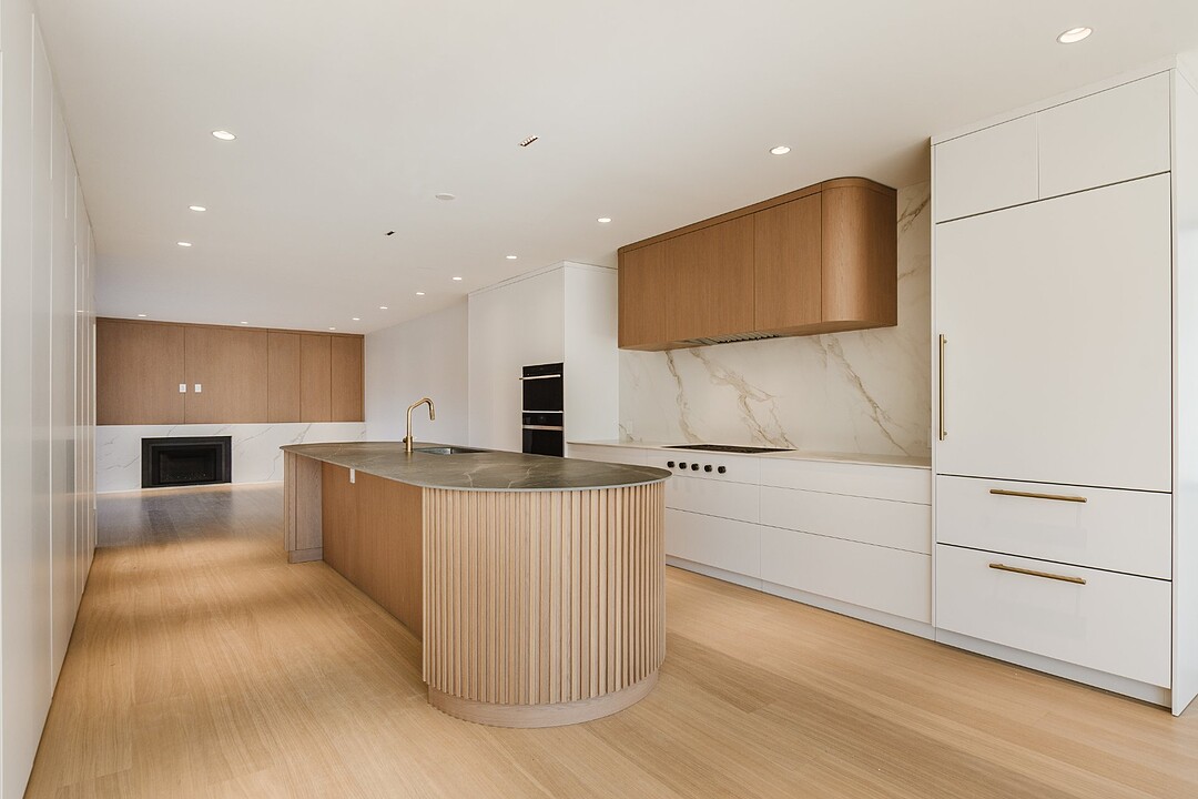 The main level offers a refined yet inviting atmosphere, anchored by a striking living room with a sculptural fireplace and seamless flow into the formal dining area. At the heart of the home, the chef's kitchen is a statement in both form and function--featuring a dramatic central island, custom cabinetry, and a curated suite of premium appliances. This space opens fluidly into a warm, light-filled family room with direct access to the terrace, creating a seamless indoor-outdoor experience.