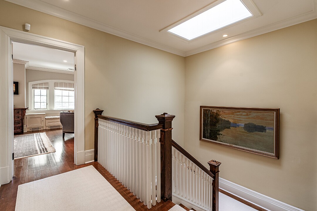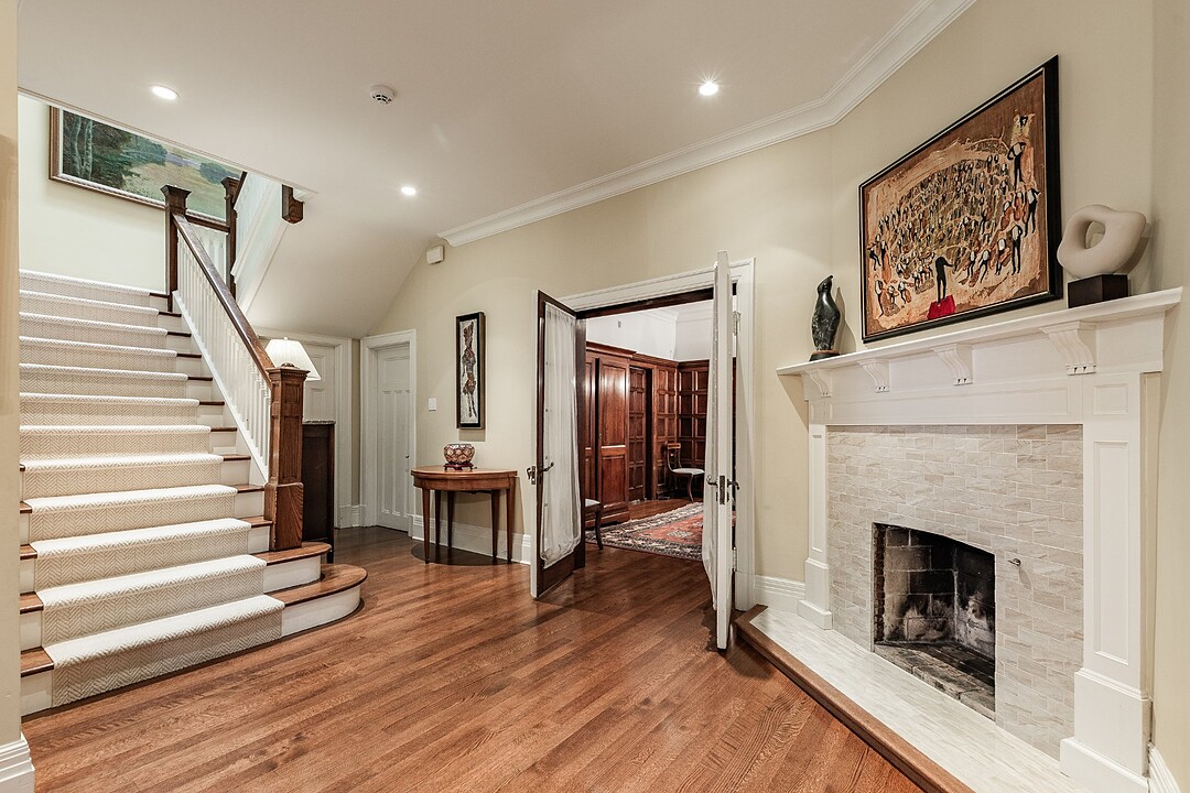 Une accueillante entrée s'ouvre sur de généreux espaces de vie dotés de riches planchers en bois, d'un beau foyer décoratif et d'un spectaculaire escalier extra-large. Le salon est spacieux et lumineux avec une vue orientée au sud, tandis que la superbe salle à manger lambrissée crée un cadre vraiment mémorable pour recevoir de grands groupes. La cuisine rénovée allie style et performance avec des appareils électroménagers haut de gamme, notamment un réfrigérateur Sub-Zero, deux fours à convection muraux et un micro-ondes Viking, ainsi qu'une table de cuisson à gaz Wolf à 6 brûleurs. Un coin repas à aire ouverte adjacent à la cuisine donne accès à la grande cour arrière, idéale pour la vie familiale au quotidien. Une salle d'eau pratique complète le rez-de-chaussée.