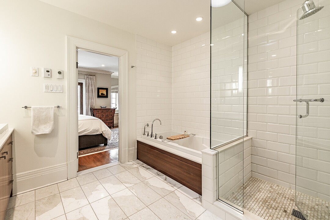À l'étage, la suite principale réaménagée est une véritable oasis offrant une vue imprenable sur le fleuve, de meubles intégrés sur mesure, un foyer au gaz et une salle de bain attenante magnifiquement aménagée avec plancher chauffant, baignoire et douche séparée. Trois autres chambres bien proportionnées sont accompagnées d'une salle de bain complète avec plancher chauffant, puits de lumière et baignoire avec douche. Un bureau/solarium lumineux offre une flexibilité supplémentaire, parfaite pour le télétravail.