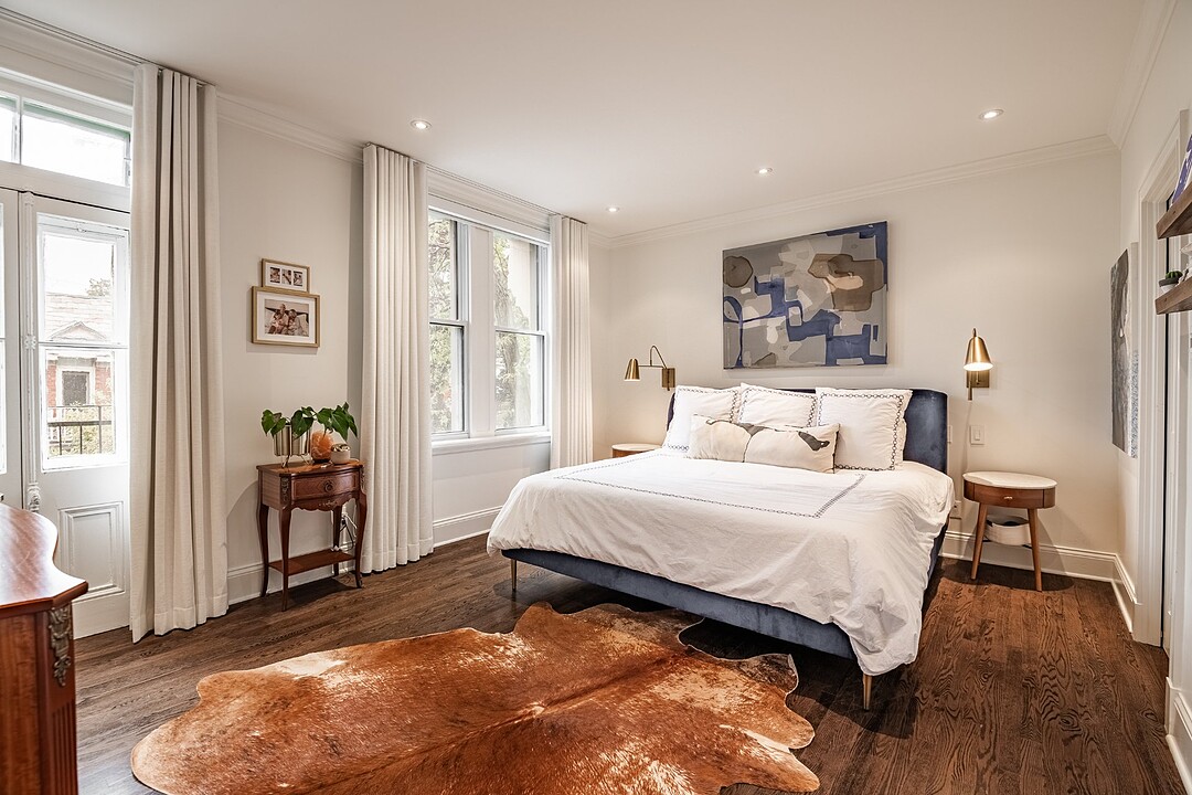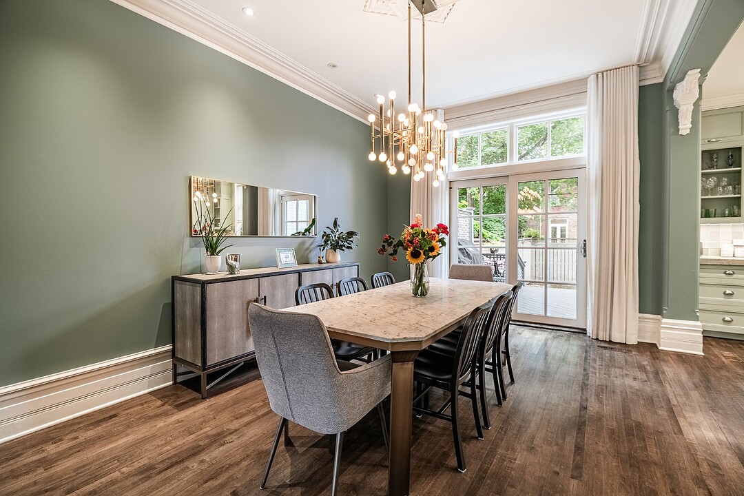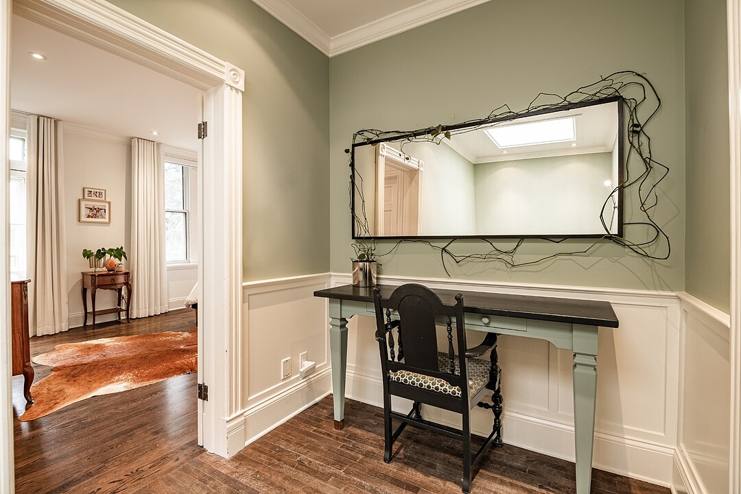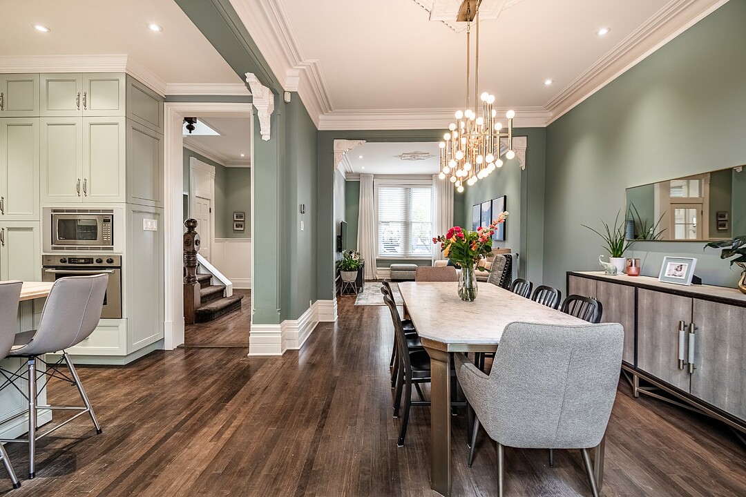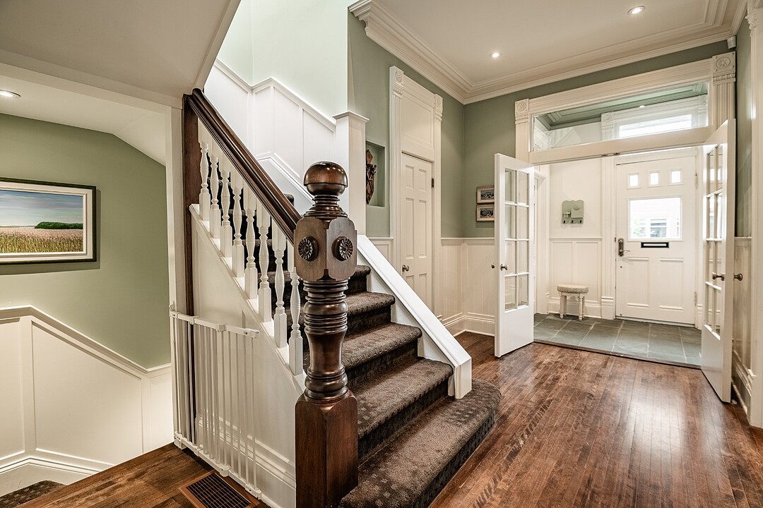 Dès votre entrée, vous êtes accueilli par un vaste vestibule doté d'un grand placard, idéal pour ranger vos vêtements d'extérieur et vos accessoires saisonniers. L'harmonieux rez-de-chaussée offre un salon baigné de soleil, orné de moulures d'origine et de détails architecturaux intemporels. À côté se trouve une élégante salle à manger, agrémentée de portes françaises qui s'ouvrent sur une grande terrasse privée, idéale pour les repas en plein air ou les réunions le week-end.