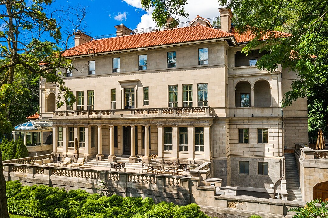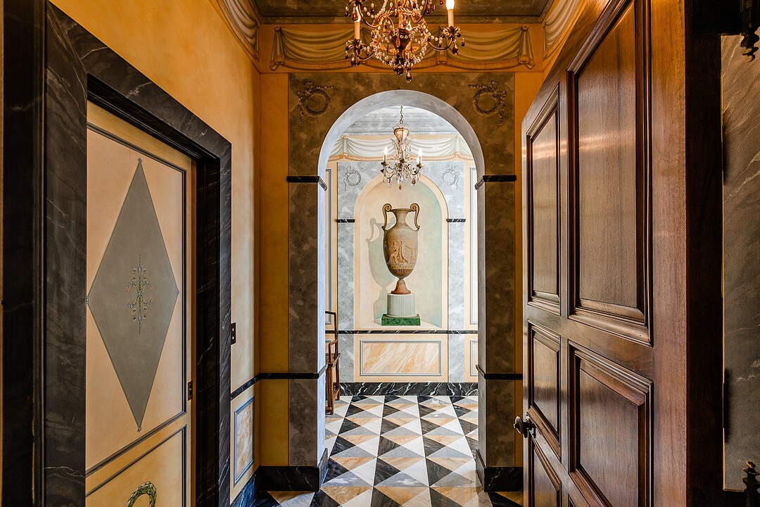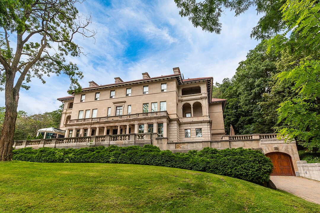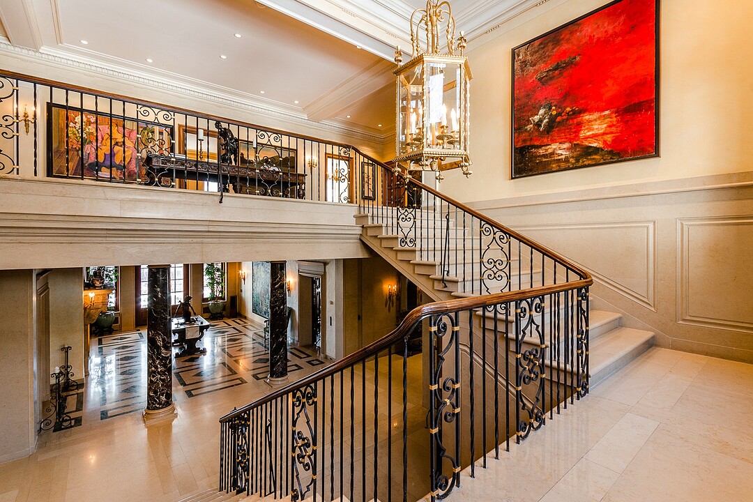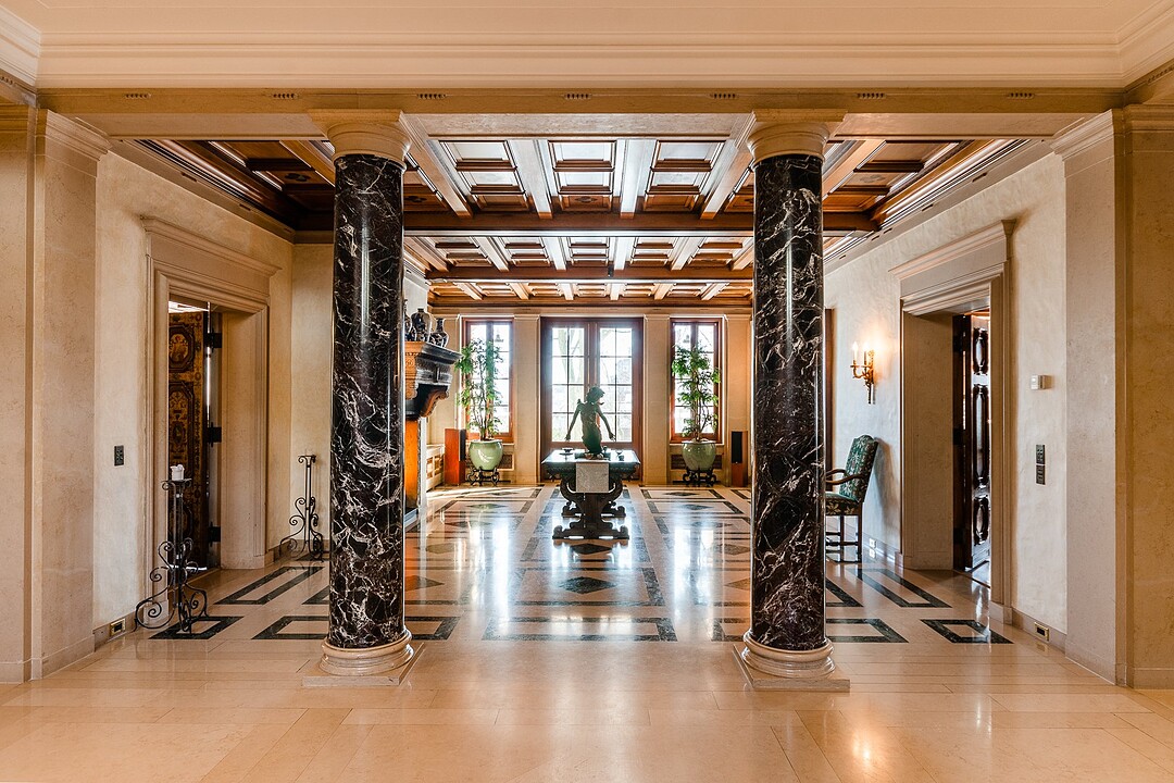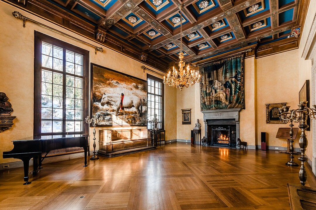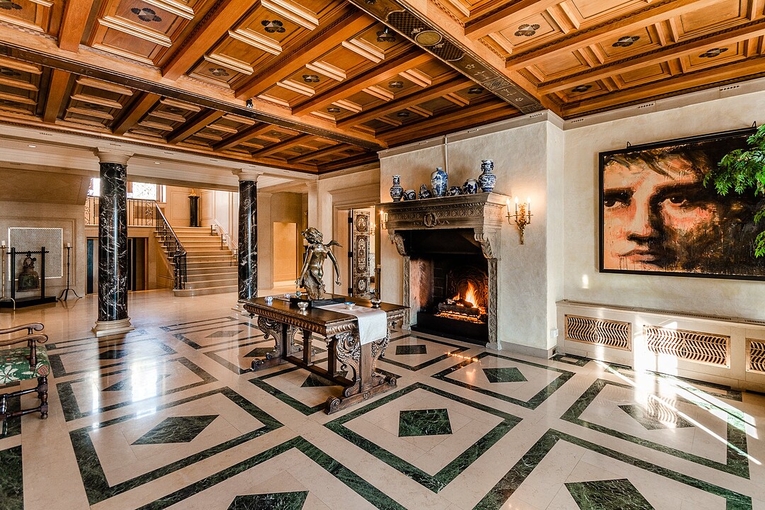 Ce magnifique manoir de 67 pièces de style néo-Renaissance italienne transcende l'ordinaire, et propose un opulent savoir-faire et un artisanat raffiné à chaque tournant. Un majestueux portail en fer forgé et feuilles d'or s'ouvre pour révéler un époustouflant hall de réception de cinquante pieds de long menant à la splendide salle des piliers, véritable incarnation de la magnificence architecturale.