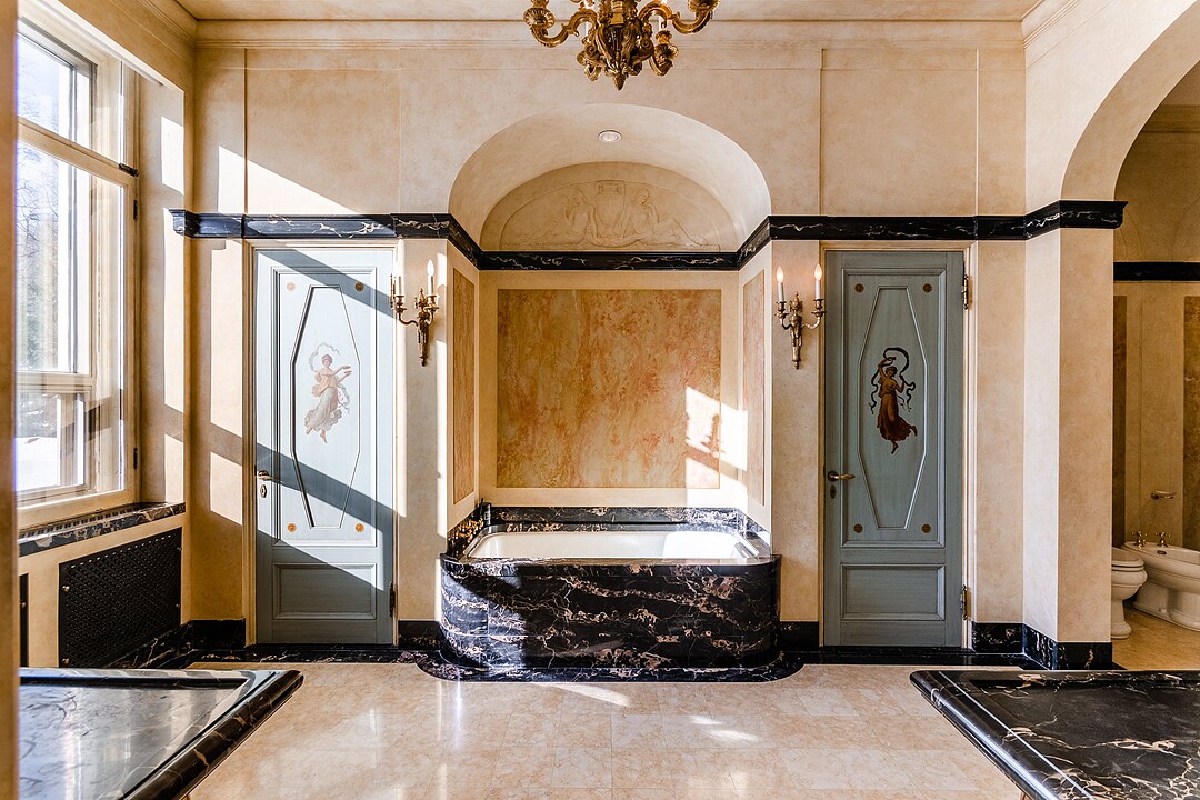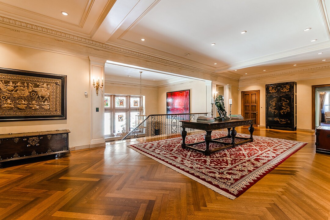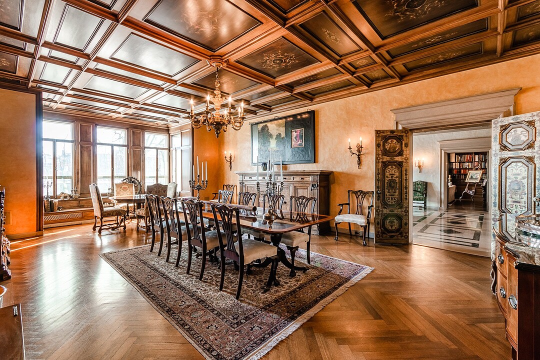 Chaque centimètre de ce domaine raconte une histoire d'élégance, de la bibliothèque revêtue d'un lambris en noyer, un refuge paisible aux allures de bibliothèque universitaire, à la vaste salle à manger magnifiquement ornée de portes réalisées dans un style renaissanciste évoquant le travail au pinceau de Raphaël. Adjacent à la salle à manger, on trouve un havre culinaire offrant une cuisine haut de gamme équipée des meilleurs appareils électroménagers, complémentée par une salle familiale et une cuisine traiteur supplémentaire conçue pour recevoir sans effort.