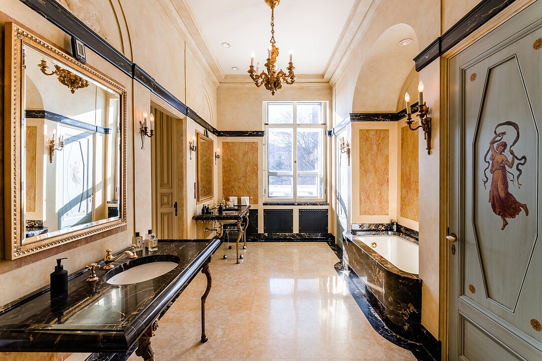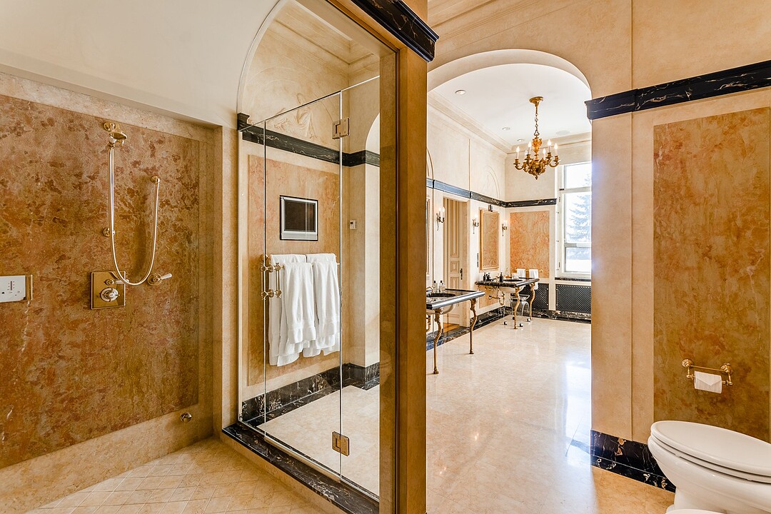 Un solarium baigné de lumière invite à la détente; il est aménagé comme chic salon pour les réunions après les heures de travail. Un opulent escalier en marbre mène au deuxième étage, où vous pourrez découvrir les sanctuaires privés -- de luxueuses suites comprenant des salles de bain attenantes pour Elle et Lui, de luxueuses penderies/dressings et de bureaux sereins.
