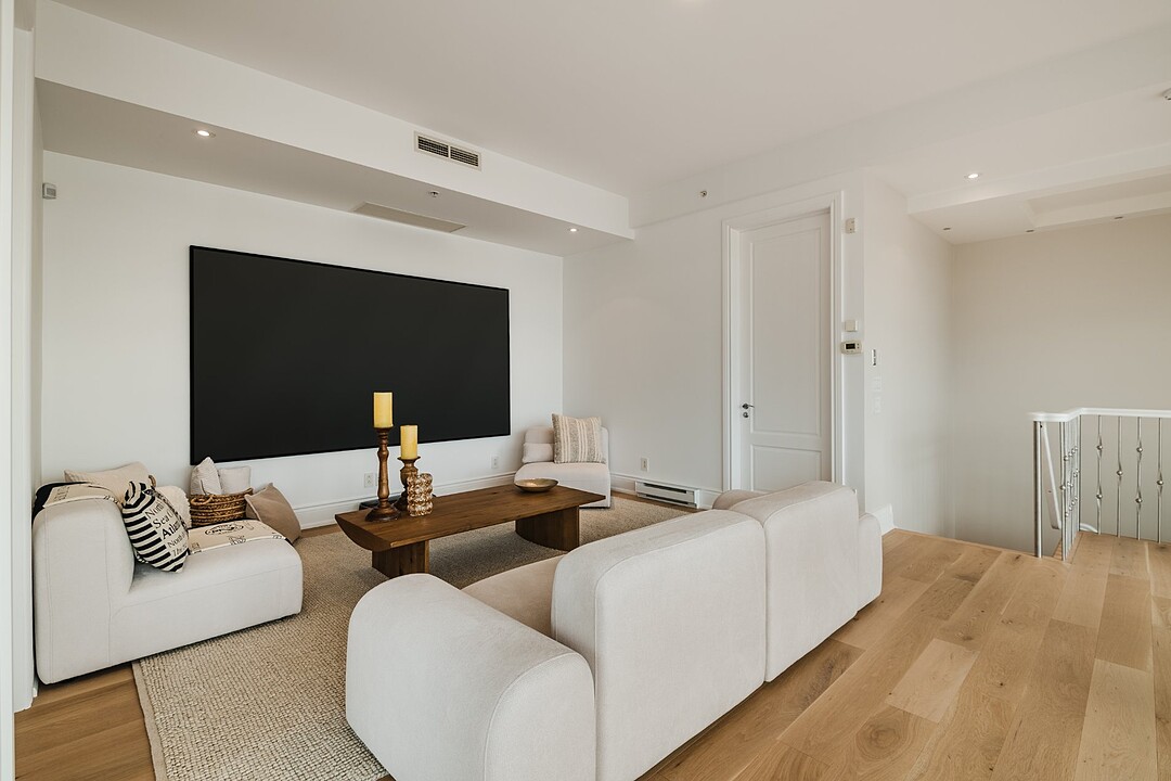 À l'étage, se trouve une lumineuse salle familiale, un lieu idéal pour se détendre, travailler à domicile ou profiter de soirées cinéma. Ce niveau comprend également une quatrième chambre et une salle de bain complète. La vaste terrasse du 2e étage offre plus de 400 pi.ca. d'espace extérieur. Que vous organisiez une soirée estivale, un dîner en plein air ou que vous profitiez simplement du cadre paisible, cette terrasse est un véritable havre de paix.